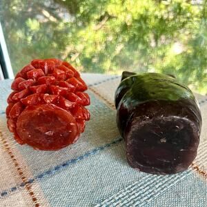 Charming set of two vintage novelty candles with rustic flair. One candle is a realistic deep red pinecone design, and the other is a brown wax sculpted figure, possibly inspired by tribal or folk art motifs. Both are unscented and unburned, with visible wicks intact.