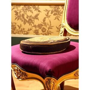 Graceful oval pillows hand-worked in fine petit point, featuring a blush rose spray and blue ribbon within a scrolling cartouche—conveying 19th-century parlor elegance in a warm cocoa palette. Likely crafted mid-century when petit point enjoyed a revival through needlework guilds and premium kit houses; made c. 1960s–70s, probably American or English. Each is neatly finished with light piping and plush brown velvet backs; perfect for Traditional, French Provincial, English Country, Grandmillennial, or Cottage interiors. Size: 17.5x12x2.5".