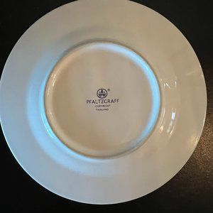 Set of 2 Vintage Pfaltzgraff Orleans pattern flat tea cups / coffee cups with saucers in a floral motif in textured blue, with green and orange accents. Cups feature a wrap around design of blue buds and vines with green and blue bands. Saucers are bordered with a narrow green band and a wider blue band. Saucers could be used as serving plates. Made in Thailand. Cups measure 2.5” tall with 3.25” diameter. Plates are 6” wide.