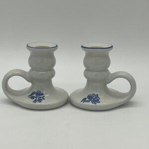 This set includes 2 vintage Pfaltzgraff Yorktowne candle holders. They're gray and blue, styled with a "flowers" pattern, and made from stoneware pottery. Each is 5" in diameter and 3" tall, featuring convenient handles.