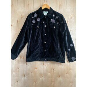 Bring the holiday cheer with this festive set of two vintage Quacker Factory jackets! Both are made of soft black cotton velour and are beautifully decorated with seasonal embroidery and embellishments, perfect for Christmas parties, winter gatherings, or cozy holiday style.