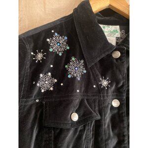 2.	Snowflake Jacket – Structured jean-style jacket adorned with sparkling embroidered and sequined snowflakes across the yoke and sleeves.  Size S, approx flat lay measurements: 21" armpit to armpit, 23" sleeve, 16.5" shoulder to shoulder, 25.5" shoulder to hem length.