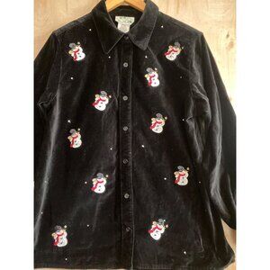 1.	Snowman Shacket – Classic button-down shirt jacket with playful embroidered snowmen in red scarves and top hats.  Size S - approximate flat lay measurements:  21 underarm to underarm, 24" sleeve length, 19" shoulder to shoulder, 28" shoulder to hem length.
