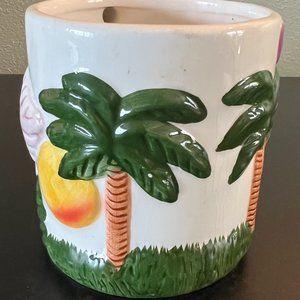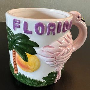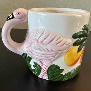 The Florida mug features a bright orange yellow sun over lush palm trees. The long curved neck of a Pink Flamingo forms the curved handle of the cup. The Jamaica mug features deep green tropical leaves and a large textured body of a lizard. The long tail of the lizard curves around to form the handle of the cup.