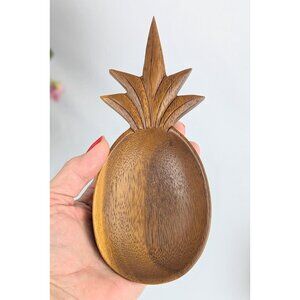 This set of two vintage hand-carved wooden bowls is made from lightweight Polynesian monkey pod wood, a material widely used in mid-century Hawaiian decorative arts. Both bowls are inscribed as originating in Hawaii and dated August 7, 1963, adding clear provenance and collectible appeal. The hand-carved construction gives each bowl subtle variation while maintaining a cohesive, matching look as a set. The bowl is approximately 6" round and the pineapple is 7.25" tall and 3" wide.
