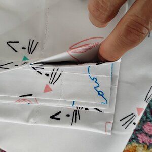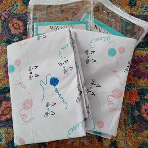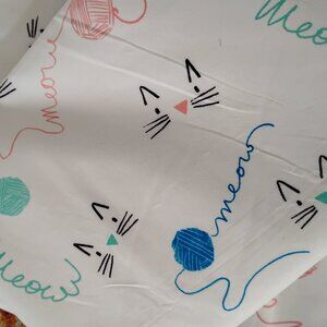 Excellent used condition, hung once. 42"Wx63"L. Bright white field with blue/green/pink/black cute kitty graphics. Rod pocket style. These are not sold as blackout but are very dense and have the feel of a heavy shower curtain. Adorable with applications beyond curtains. Ships with original packaging.