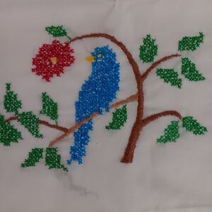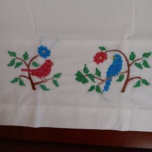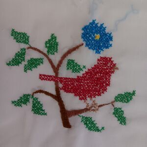 Set of 2 White Hand Cross Stitched Pillowcases Blue & Red Birds on Branch