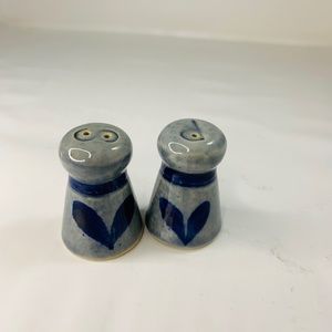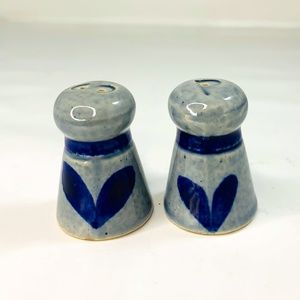 Set of 2 mini glazed pottery salt and pepper shakers with blue hearts unmarked. great for traveling rv camping. Rubber stoppers. Primitive colbolt blue hearts on both sides. Does have small crack in the bottom (as pictured) of the Salt. See approximate measurement pics. I believe these might be vintage from the 80s or 90s. Smoke free home.