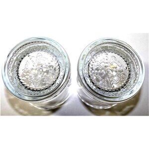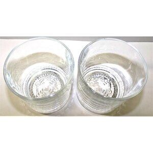 Set of two Crown Royal short (3.5 inches) rocks glasses. Glasses are made in Italy. and the words, Crown Royal, are molded in the bottom of each glass. They are in excellent used condition - no visible cracks, chips, fleabites or crazing.