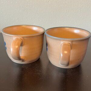 Set of 2 vintage Pfaltzgraff Folk Art stoneware coffee / tea cups featuring a rustic blue floral design set against an earth-tone (tan/beige) background with a blue rim. Pfaltzgraff introduced this pattern in 1980. Microwave safe. Measures 2.75” tall with a 3.5” diameter. Holds 10 fluid oz. From Pfaltzgraff. Made in USA.