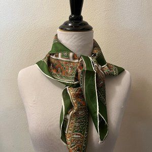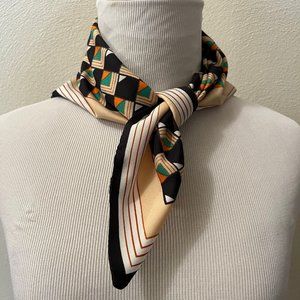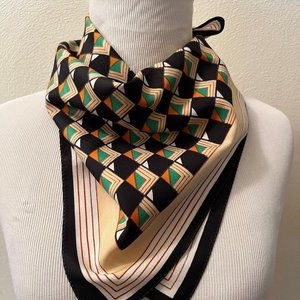 These are 2 great vintage multicolor scarves in geometric prints. Both have green as their dominant color. The smaller of the two measures 20" square and has green, black, orange, gold & cream colors in its design and I believe to be acetate (no tag). The larger one is 27 1/2" square has hand rolled & stitched edging and has green, orange & white as its colors. It is 100% rayon & comes from Japan.