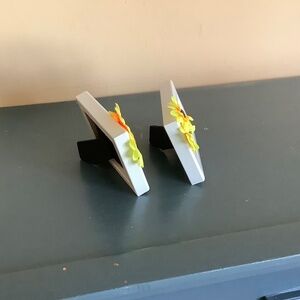 This is a listing for a set of two 2” x 3” handmade white plastic painted picture frames embellished with two silk sunflower blooms on each frame.