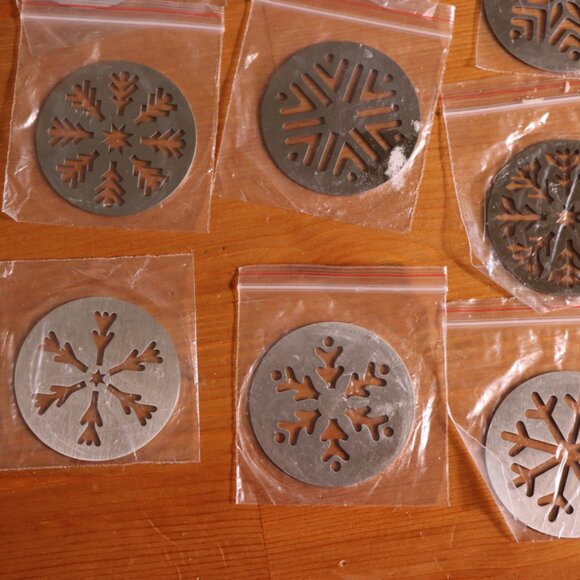 cookie press disks metal snowflake designs holiday baking christmas cookies winter crafts kitchen tools baking accessories cookie maker snowflake press festive decor diy craft supplies cookie press replacement disks metal baking tools reusable durable bakeware holiday kitchen gift idea handmade creative snowflake decor ornament making winter wonderland christmas crafts rustic farmhouse cottagecore kitchen baking enthusiast food art snowflake cookie patterns pastry press cookie shapes snowflake molds unique bakeware vintage inspired bake shop cookie dough press dessert making sugar cookie designs shortbread cookie tools stainless steel disks reusable patterns festive baking party entertaining kitchen decor cozy home baking gif