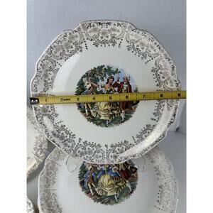 Vintage dinnerware set, likely French Saxon China, featuring a 22k gold pattern and a romantic, rococo-style scene with figures in period attire.