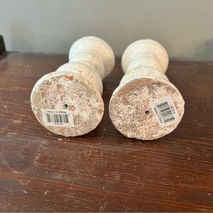 These two white pedestals are heavy and they could be used for decorating for a number of things, candles, figurines, or just use as a pedestal in decoration