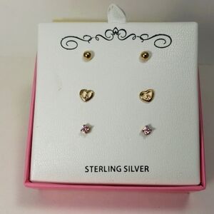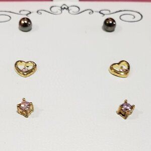 Pink cubic zirconia is the star attraction of this three-piece stud earrings set which includes polished ball stud earrings, pink cubic zirconia stud earrings, and heart-shaped cubic zirconia stud earrings. Approximate diameter: 1/8". Macy's Brand, shelf pull item.