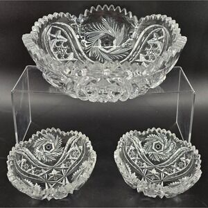 Bowls are all in very good preowned condition. There is a chip on the inside of the big bowl on the Sawtooth edge (see photo). You can't see it from the outside. No other chips or cracks. No sick glass. Minimal scratching from normal use. They are clean and ready to join your Early American Pres Cut Glass Collection.
