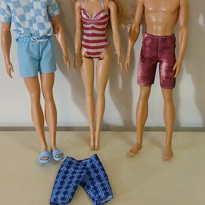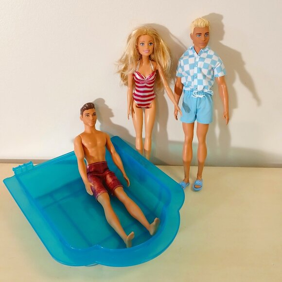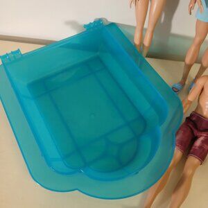 Set of 3 Barbie dolls with pool/hot tub and extra swim trunks. Ken is wearing swim trunks with matching top and flip-flops. Dolls in excellent condition. Pool is 11 x 9 inches.