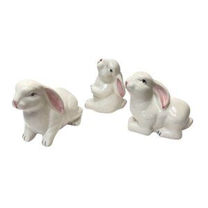 Set of 3 Ceramic Bunny Figurines Hand Painted Glazed White Rabbits Easter Decor