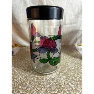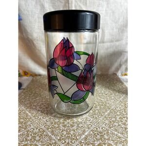 Retro vintage set of 3 glass canisters in graduating sizes by Cerve, made in Italy. This set has a stained glass style tulip pattern and the original seals on each jar. Decorative and functional kitchen ware design, great to use or for display only.