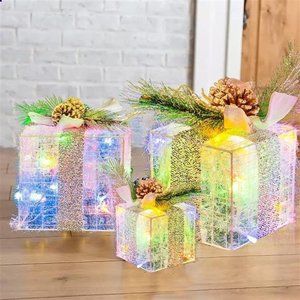 -Lighted Gift Boxes for Christmas: 3 pcs of lighted gift tinsel boxes has different size, decorated pre-lit with 60 LED multi color lights. Colorful lights emit to the tinsel and reflect the shiny lights, as if walk in to a dream land. Place it next to the Xmas tree or any other place you want, it will add a festival spirit for Christmas.