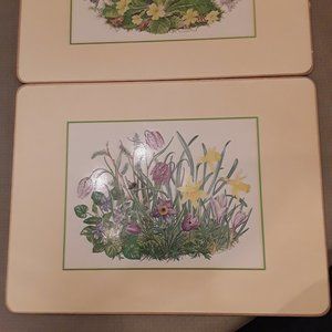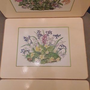 Set of 3 Floral Cork Table Mats Clover Leaf Elizabeth Rice Design UK 15x11.5. Adorable! VGUC. Wear around gilded edge consistent with age and usage (see photos). Vintage.