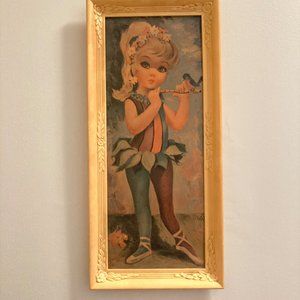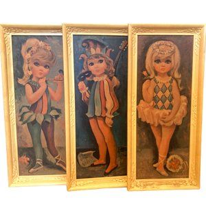 Set of 3 framed big eye prints by Goji, dating to the 1960s. These are framed in very cool cream/yellow plastic frames and backed with cardboard. They come from the golden age of big eye portraits that originated with the paintings of Margaret Keane. I do have the fourth print, but the frame is broken and that print has significant water damage. If you'd like to work out a deal for all four (or would like photos of the fourth) let me know. These came from a country estate full of day-glo midcentury items.