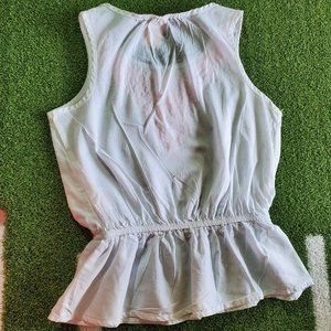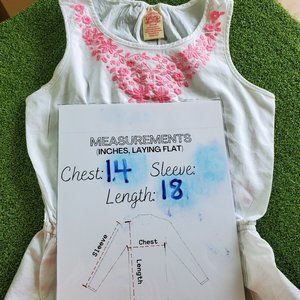 Details: pullover, sleeveless, embroidered pink florals, elastic waist