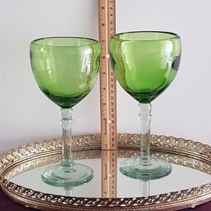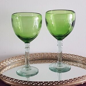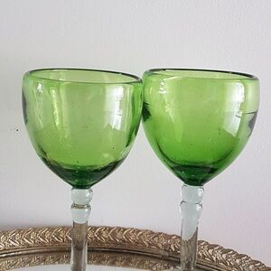 Set of 2 hand blown wine glasses with green glass cup and clear glass stem. Each wine glass is unique as these are hand blown glass.