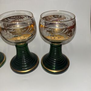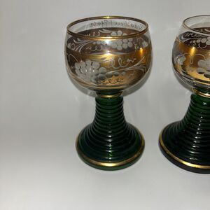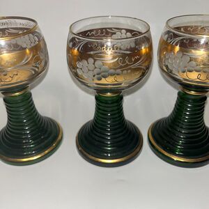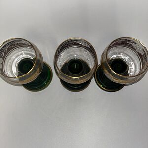 Set of 3 Green Glass Gold Trimmed Goblet Wine Glasses Textured Fruit