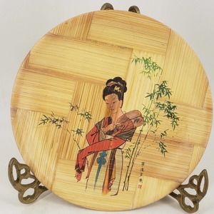 Set of 3 Hand Painted Woven Bamboo Plates Decorative Plates. Measures about 6" D. In great condition w/ a bit of wear.