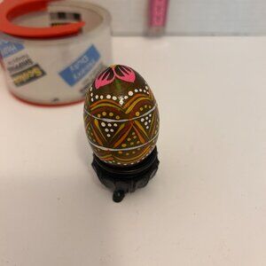 • Brown/pink geometric egg — intricate hand-painted folk pattern with pink floral top design.