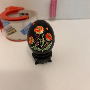 • Black floral egg (2008) — bold red and yellow blooms on a black background, dated 2008 on the base.