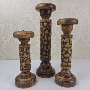 Set of 3 Handmade Graduated Wooden Candle Holders Brown Textured Unique
