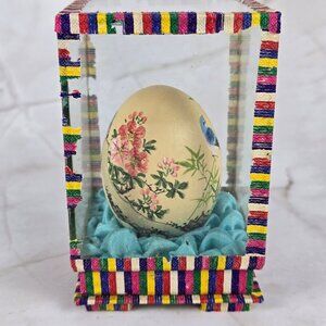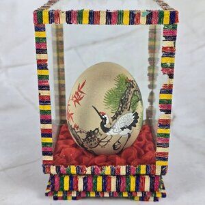 This is a set of 3 individual display boxes each holding a handpainted "egg". The eggs have an Asian theme with blue birds, cranes, cherry blossoms and flowers. Each egg is nestled on a colorful fabric. Footed display box.