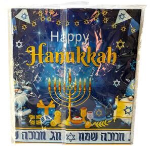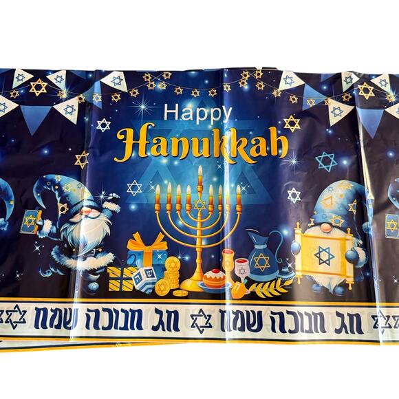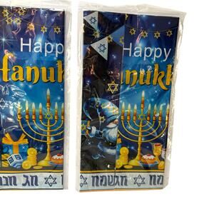Brand new set of 3 Hanukkah plastic tablecloths featuring a festive blue design with menorahs, Stars of David, dreidels, coins, and holiday gnomes. Perfect for decorating tables during parties, dinners, classroom celebrations, or community events.