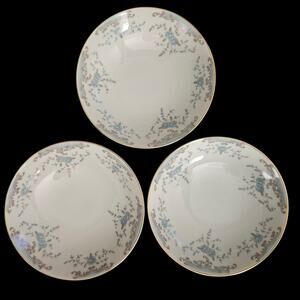These vintage bowls feature a delicate design of blue roses and scrolling tan accents, finished with a fine gold trim on a creamy white background. Made in Japan.