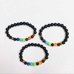 🌺Fashion Elastic Bracelets w Black Volcanic Rock Beads - Set of (3) Chakra