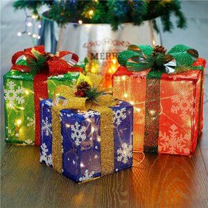 🧿These lighted gift boxes are made of sturdy metal frame and covered with high quality fabric which has a tinsel glitter effect, makes a cheerful holiday statement for Christmas indoor or outdoor decorations.