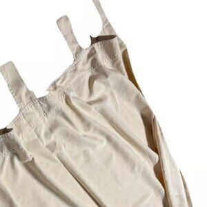 A set of 3 mirofiber curtain panels with tab top headings. Solid beige body with a red, faux-silk border trim at each hem. The hem also features some embroidery detail. Lightweight and unlined. No fabric or designer labels intact.