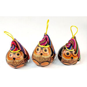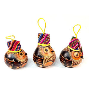 Set of 3 Margarita & Martha Dried Mate Gourd Owls w/Hats Handcrafted Ornaments