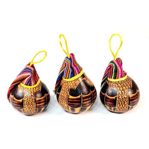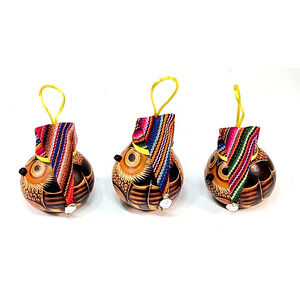 Wearing colorful caps with flowers on the end, three owls patiently await the holiday season. Peru's Margarita and Martha handcraft the sweet bird ornaments of dried mate gourds. The bird ornaments arrive nestled in a storage box.