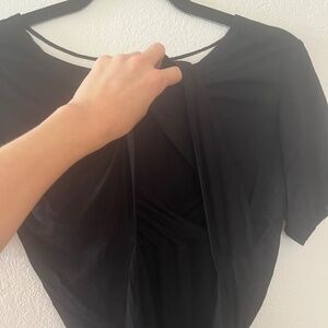 Set of 3 maternity and nursing t-shirts in black, blush, and gray. Top part lifts up with a crossover style layer underneath for discrete nursing. Lightweight, soft, and stretchy material.