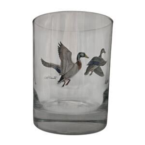 Set of three vintage old fashioned glasses featuring detailed flying mallard ducks, artwork signed by Norman R. Warner. Each glass displays vivid, realistic wildlife imagery—ideal for barware collectors or nature enthusiasts. Clear glass with crisp prints, minimal wear from age, no chips or cracks. See photos for details.