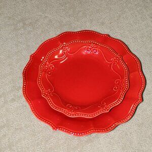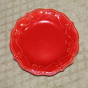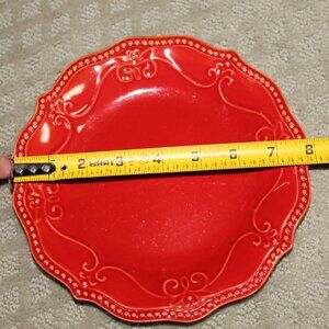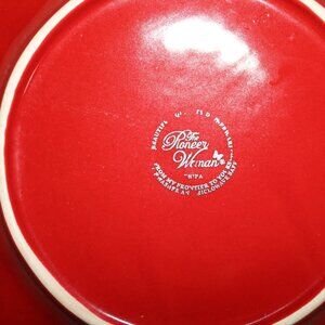 Enhance your dining experience with this set of three Pioneer Woman Salad Plates in the Farmhouse Lace Claret Pattern. These plates are perfect for all occasions and feature a round shape with a diameter of 8 inches. The plates are made of durable stoneware material and are break/chip resistant, microwave safe, and dishwasher safe. The red plates are adorned with a beautiful lace pattern that adds a touch of elegance to your table setting. The shiny finish and the cowboy & western food/kitchen theme make these plates a perfect addition to your collection. These original Pioneer Woman plates are sure to impress your guests and make your meals more enjoyable.