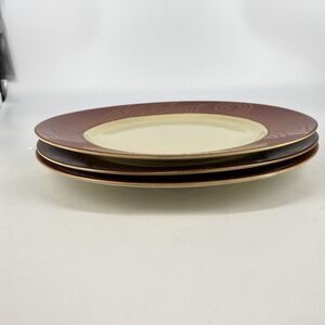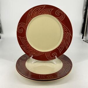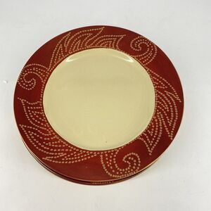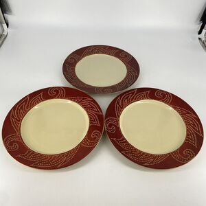 Set of 3 Pier 1 Matira Dinner Plates Tan Red Rim Dotted Scrolls 10 1/2"