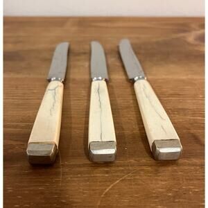 These vintage knives have a classic squared handle design with a subtle marbled finish, perfect for mid-century table settings or as replacements in your existing Robeson Continental flatware set.