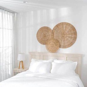 This traditional style inspired wall art set features woven and bound seagrass in a round design with a flower silhouette on the surface