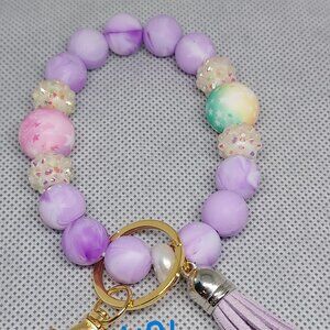 These stunning, handmade by me, beaded Keychains feature a stretch elastic design with silicone beads alternating with wood, stones, and metal beads on certain designs. To each bracelet, there are gold or silver keychains attached along with silk or suede tassels. These bracelets are flexible to fit comfortably over the wrist for a hands-free way of carrying your keys and accessories while your hands are filled with children, groceries, packages, etc. This is a stylish way of keeping track of your keys while on your wrist, in your purse, or by the door ready for pick up. The set of three will give you personal color choices or allow you to share with friends and family. Makes great gifts for co-workers, friends, and family.