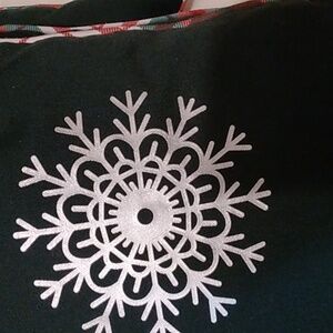 Set of 3 Snowflake Christmas pillows. Snowflakes are a printed silver metallic on a dark green background. Back is red and green plaid and there is piping around edges.